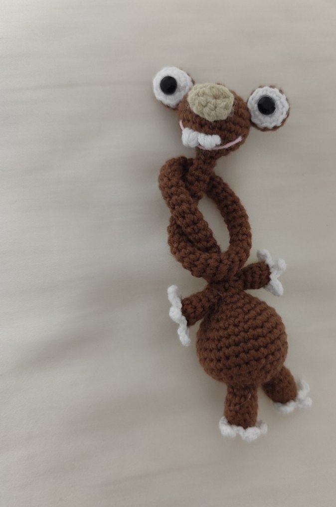 Bu kahverengi peluş oyuncak, büyük gözlere sahip örgü dokusuyla el yapımıdır ve renkli, eğlenceli bir tasarıma sahiptir.