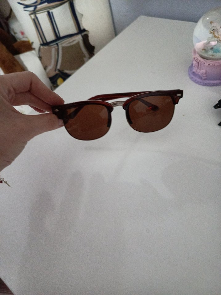 Kahverengi, retro tarzda kadın güneş gözlüğü, minimal ve bohem dokunuşlu, koyu renkli lenslere sahip. ️