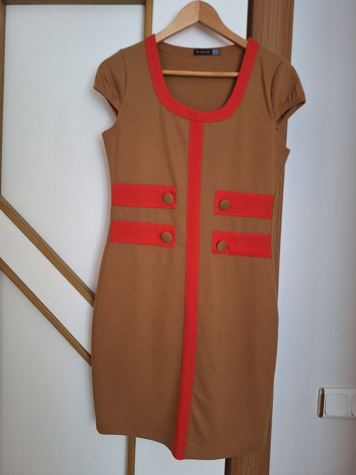 Kahverengi pamuklu kumaştan, kırmızı detaylı, düğmeli, kısa kollu, retro tarzda midi ellbise.36-38 bedene uygun.Bir iki defa kullanıldı temiz sıfır hata