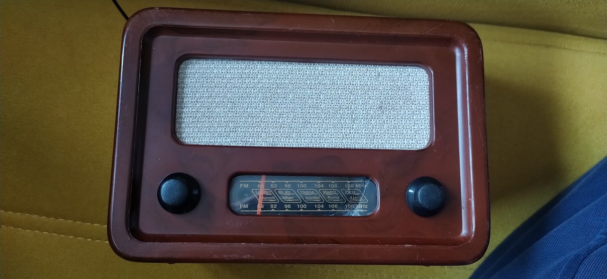 Kahverengi retro tasarımlı müzik sistemi, FM radyo frekans göstergesi ile çeşitli şehir isimlerini içerir. Çalışıyor sesi çok güzel FM ÇALAR ÇOK GÜZEL ÇALIYOR içi dışı tertemiz