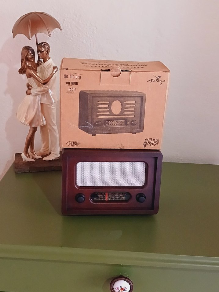 Klasik tasarıma sahip koyu kahverengi retro müzik sistemi, önünde hoparlör ızgarası bulunur. Kutusunda nostaljik tasarım ve 'The history on your table' yazısı yer alır.