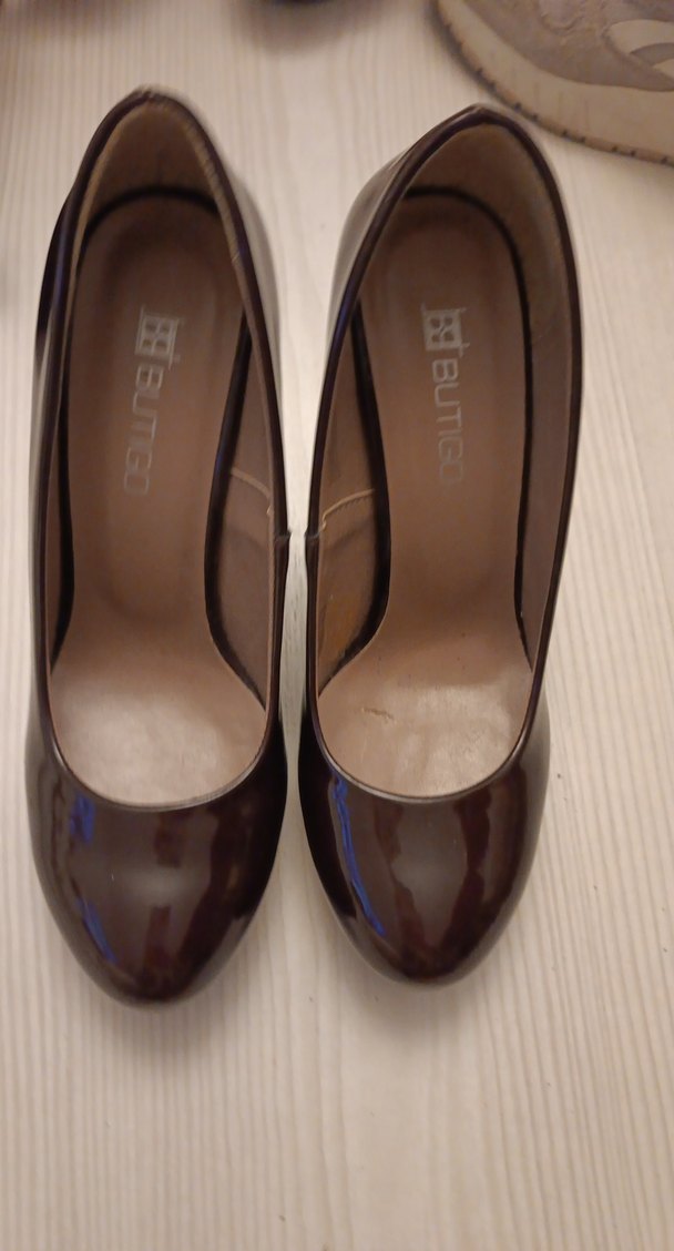 Kahverengi, tokalı stiletto topuklu ayakkabılar. Koyu renk, desensiz ve kauçuk malzemeden üretilmiştir. Ofis için klasik ve gotik tarzda. Marka: Butigo.