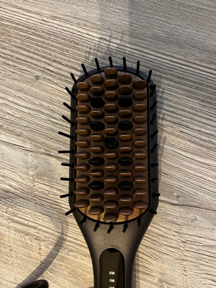 Isı ayarlı kahverengi saç düzleştirici fırça, pürüzsüz şekillendirme için.