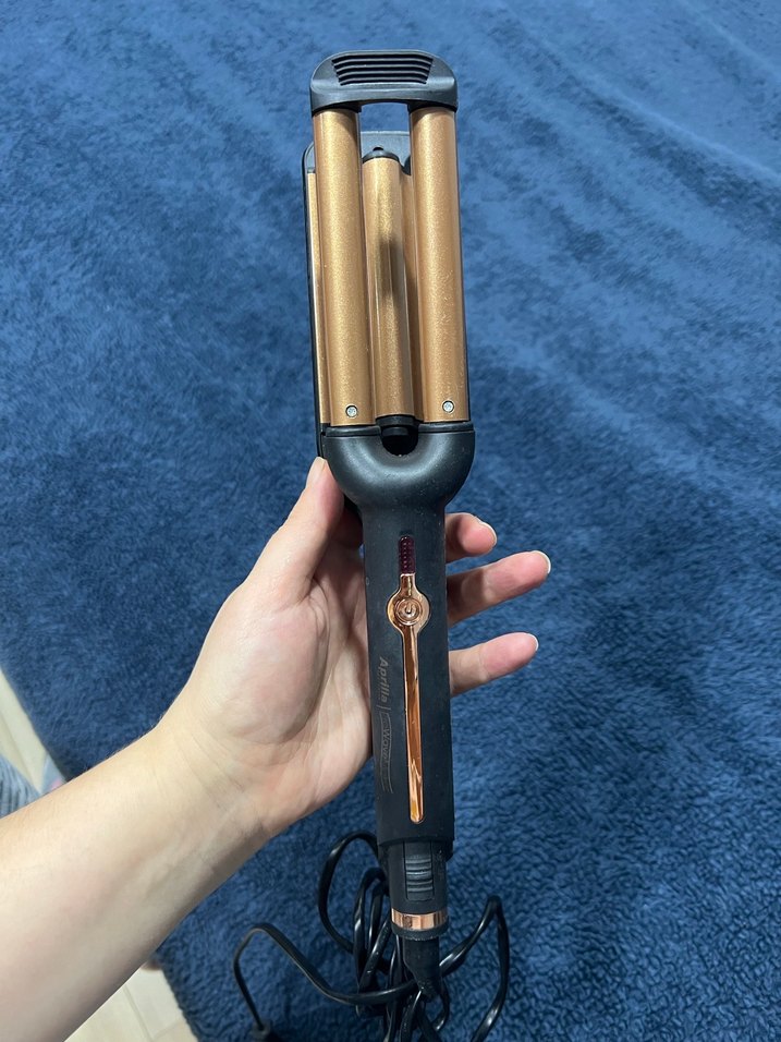 Koyu kahverengi camel renkte, dalgalı ve kıvırcık saçlar için çift varilli saç şekillendirici. Kompakt sap ve kontrol düğmesi bulunur.