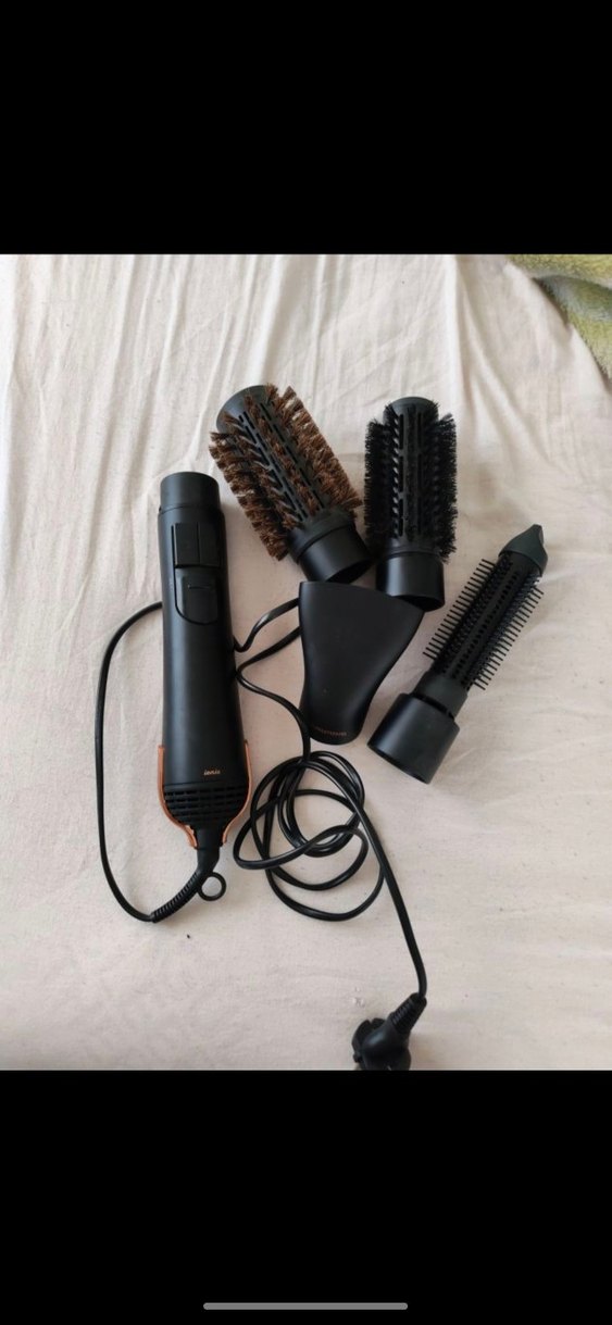 Kahverengi saç şekillendirici seti, ana tutacak ve dört farklı başlıktan oluşur: iki yuvarlak fırça, daraltıcı ağızlık ve tarak fırça, çeşitli saç şekillendirme için uygundur. ♀️