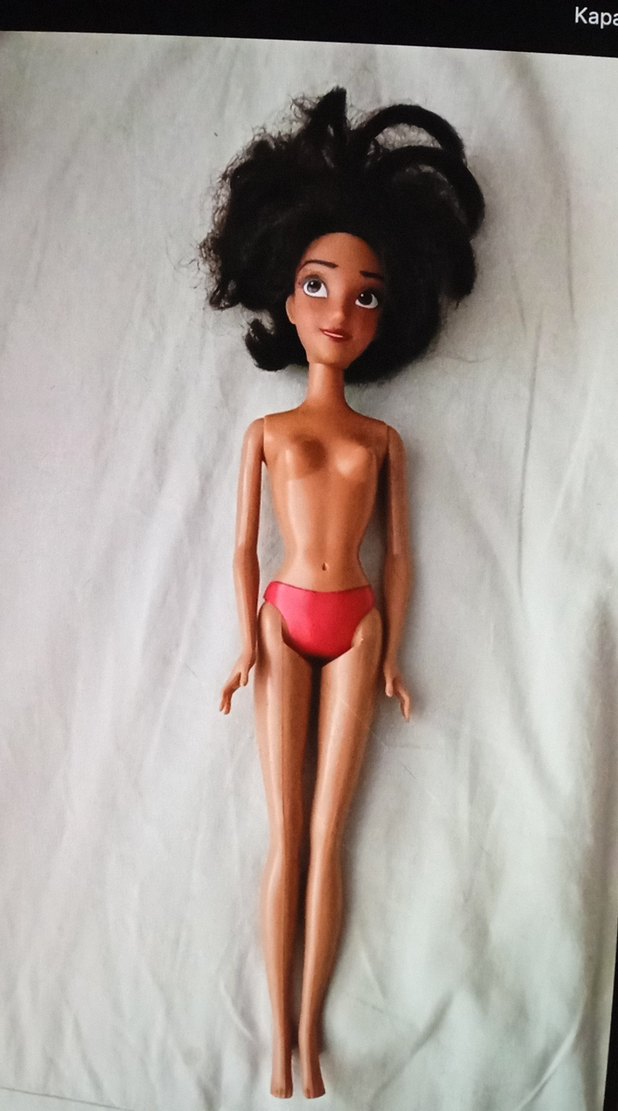 Kahverengi saçlı, koyu ten renginde, kırmızı iç çamaşırı giymiş bebek oyuncak. Uzun saçlı ve hareketli uzuvlara sahip.