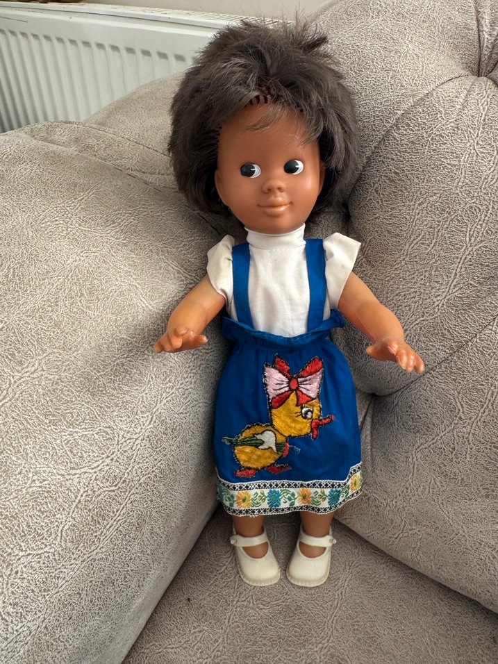 Kahverengi saçlı bebek, beyaz tişört ve renkli tavuk işlemeli mavi elbise giyiyor. Beyaz ayakkabıları var.