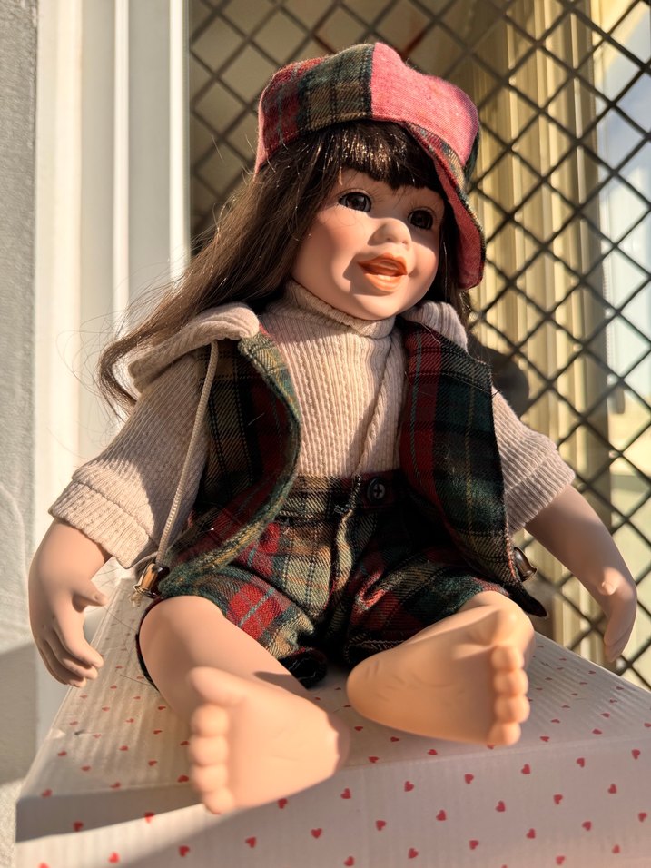 Kahverengi saçlı oyuncak bebek, ekose desenli kıyafet ve şapka giymiş, bej renkte yumuşak bir kazak var. Kazağında kolunda hafif bir kutu lekesi var sıfır kutulu ürün