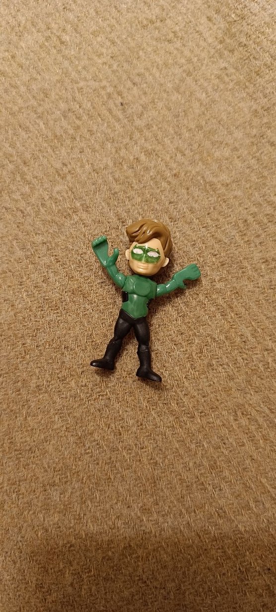 Koyu kahverengi saçlı, yeşil maskeli, yeşil eldivenli ve siyah pantolonlu küçük aksiyon figürü. Kolları yukarıda poz verilmiş.