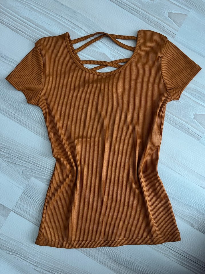 Kahverengi, kısa kollu, tek renk ve vücuda oturan kadın tişörtü. Yumuşak sentetik kumaştan, günlük kullanıma uygun.