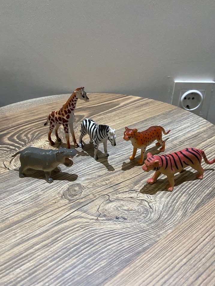 Kahverengi ve koyu tonlarda zürafa, zebra, leopar, su aygırı ve kaplan figürlerinden oluşan safari hayvan seti. Oyun veya koleksiyon için uygundur.
