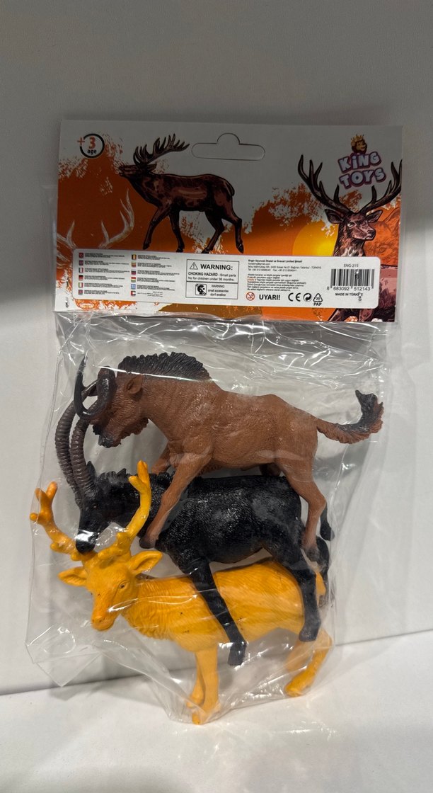 Üç adet kahverengi tonlarında safari hayvan figürü seti. Sarı geyik, siyah antilop ve kahverengi bizon detaylı tasarım.