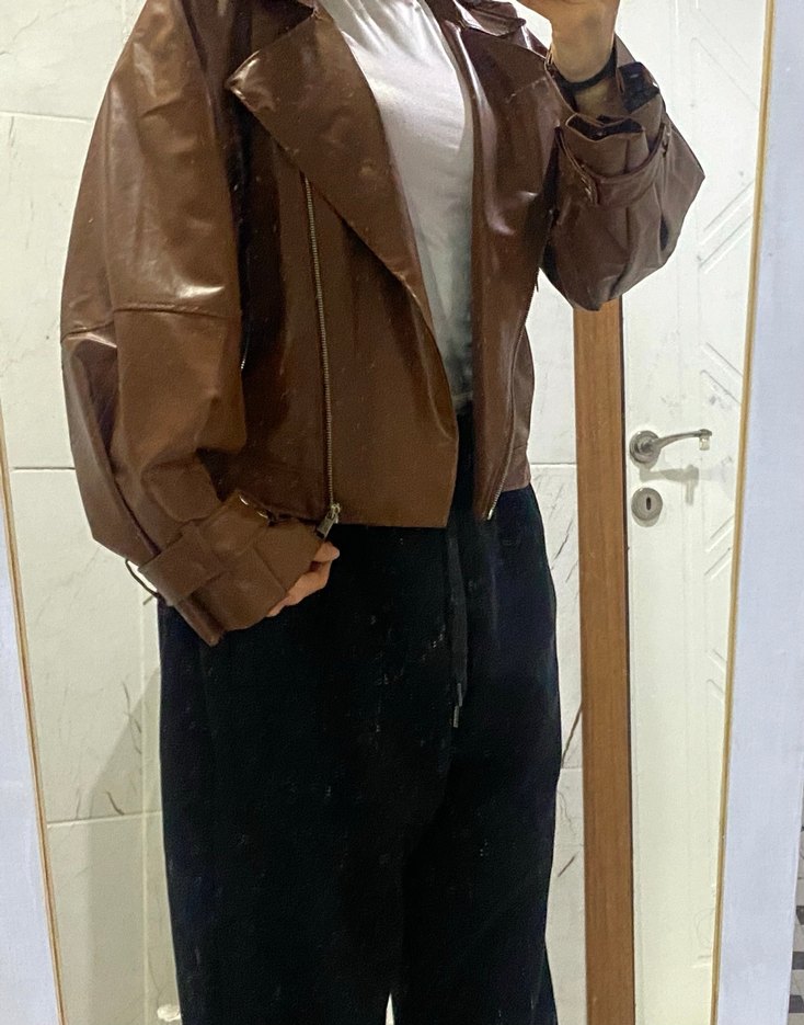 Kahverengi deri balon kol ceket, bol kesim Notlu yaka ve uzun kolludur, günlük rahat kullanıma uygundur. (Defosu yok ürünü bi kaç kez giydim zaten )