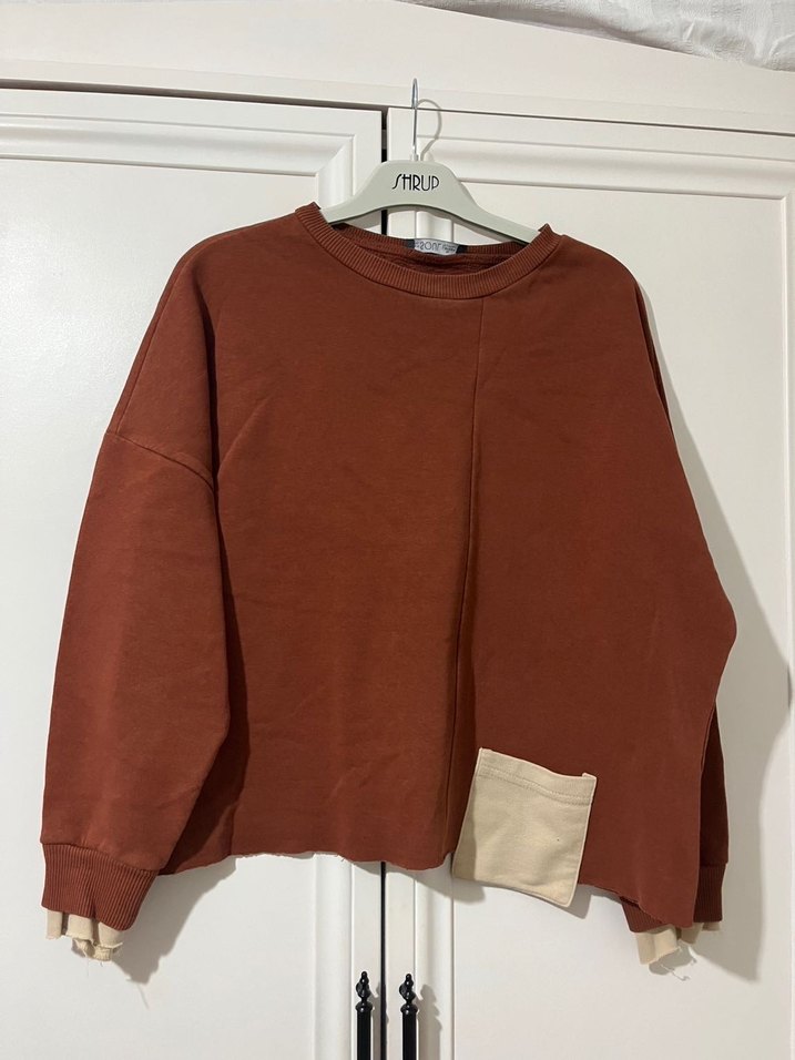 Kahverengi, yuvarlak yaka, uzun kollu ve salaş kesim linensweatshirt. Rahat ve şık duruşuyla gündelik sokak modasına uygundur.