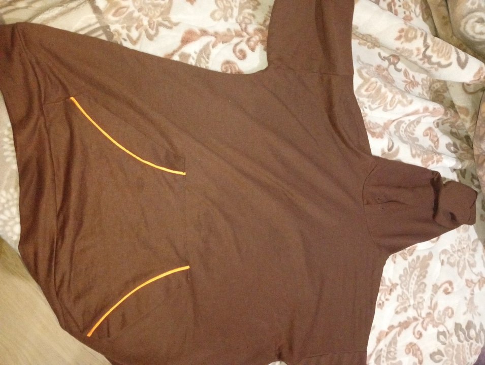 Kahverengi, keten kumaştan salaş kesim hamile tişört. Yuvarlak yaka, kısa kollu ve normal midi boydadır. Günlük kullanıma uygundur. tayt üzerinde güzel duruyor