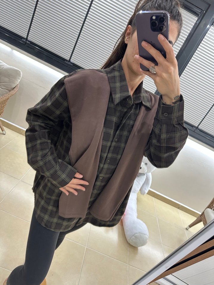 Kadın gömlek, kahverengi, salaş kesim ve midi boyda. Uzun kollu, kesik yaka ve sentetik kumaştan, günlük kullanıma uygun şık bir parça. M beden