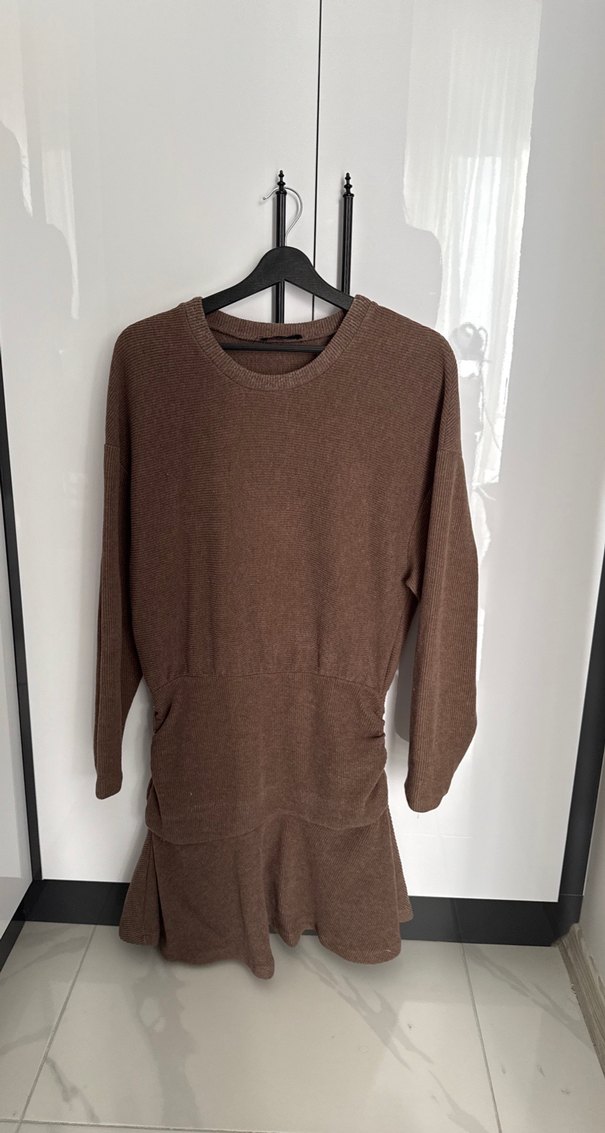 Kahverengi, salaş kesim, keten kumaştan, yuvarlak yakalı ve uzun kollu midi kazak elbise, rahat ve şık kullanım sağlar.