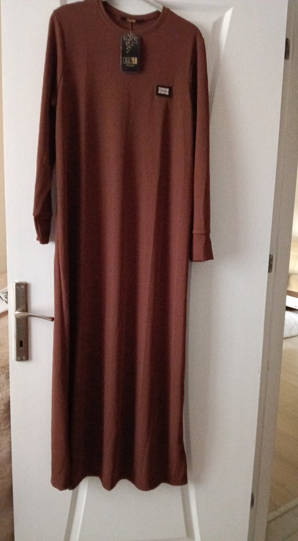 Kadınlar için kahverengi, salaş kesim uzun elbise. Drapeli, uzun kollu ve yuvarlak yakalıdır. Düz renk, sentetik kumaştan, günlük şık kullanıma uygun.