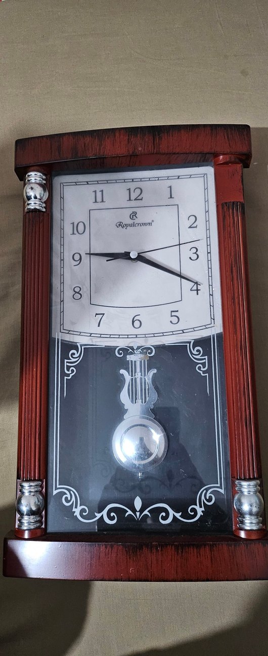 Kahverengi ve koyu tonlarda, Royalcronn marka, klasik tasarımlı salıncaklı duvar saati. Üstte kare kadran ve alt kısımda dekoratif salıncak bulunur. ⏰