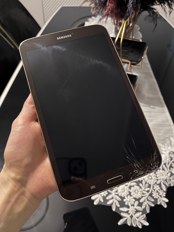 Kahverengi Samsung tablet, çatlak ekranlı, kompakt ve taşınabilir tasarıma sahip. Günlük kullanım için uygun. Alt köşesi kırık harici sorunsuz android 7 yüklü