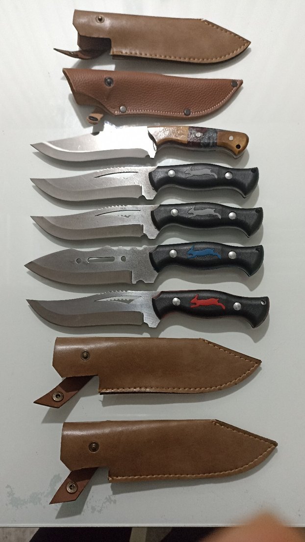 Beş adet kahverengi saplı av bıçağı seti, farklı tasarımlı bıçaklar ve kahverengi deri kılıflar içerir.Tekli fiyattır,Bel kılıflıdır.sıfır üründür.