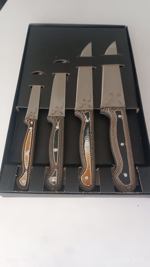 Kahverengi saplı ve paslanmaz çelik bıçaklardan oluşan 5 parçalık bıçak seti, farklı mutfak işleri için uygundur.