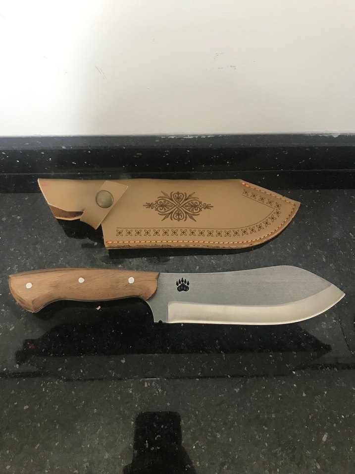 Ahşap saplı ve keskin paslanmaz çelik bıçağa sahip, süslemeli kahverengi deri kılıfla birlikte gelir.