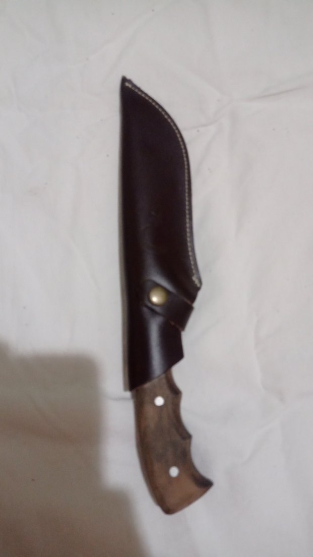 Kahverengi ahşap saplı bıçak ve dikiş detaylı, çıtçıtlı deri kılıfı.