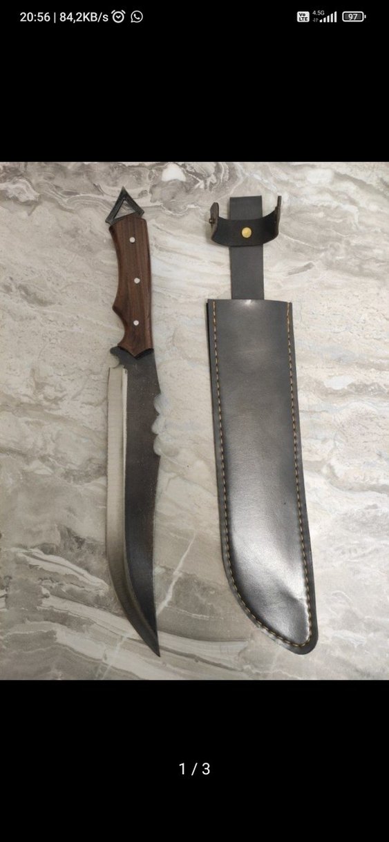 Kahverengi ahşap saplı, keskin ve kavisli pala ile siyah deri kılıfı bulunur. Güvenli saklama için uygundur.