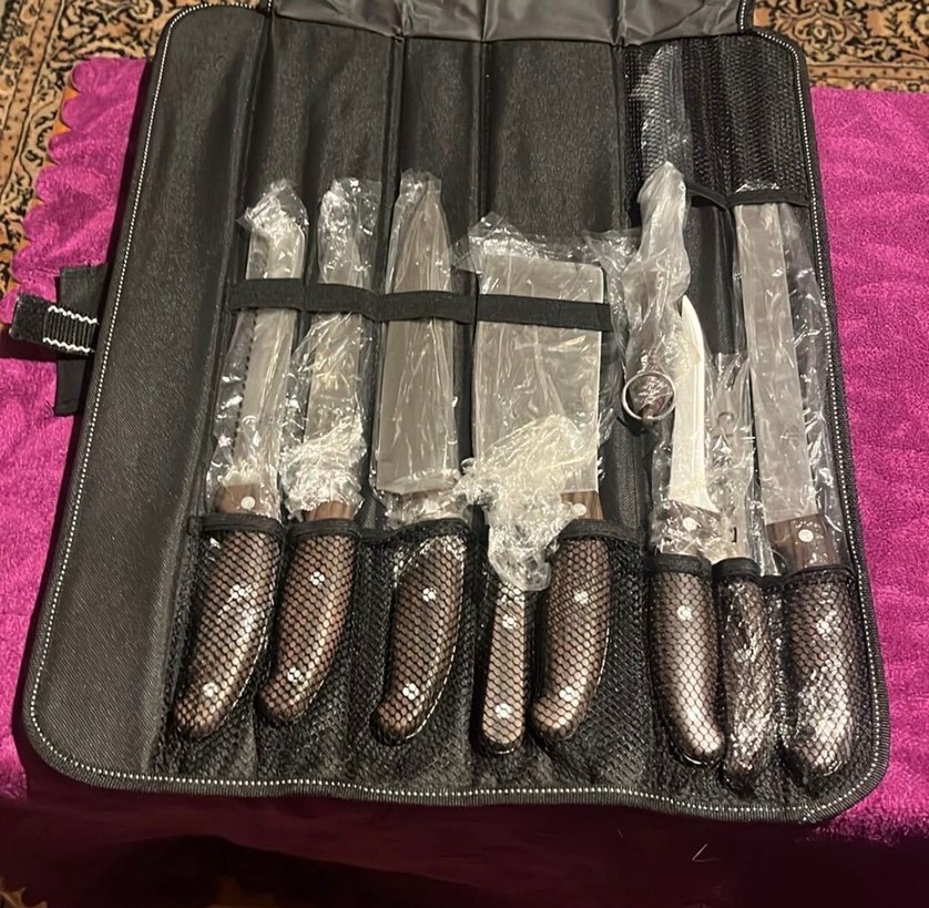 Kahverengi saplı mutfak bıçakları, siyah saklama çantasında yer alır. Her bıçak koruma amaçlı ayrı ayrı paketlenmiştir. Sıfırdır Almanya’dan hediye geldi 9 parça