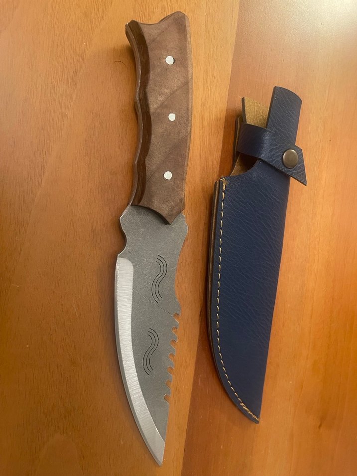 Kahverengi saplı, dişli ve desenli bıçağa sahip av bıçağı, düğmeli kapamalı koyu renk kılıfla birlikte.