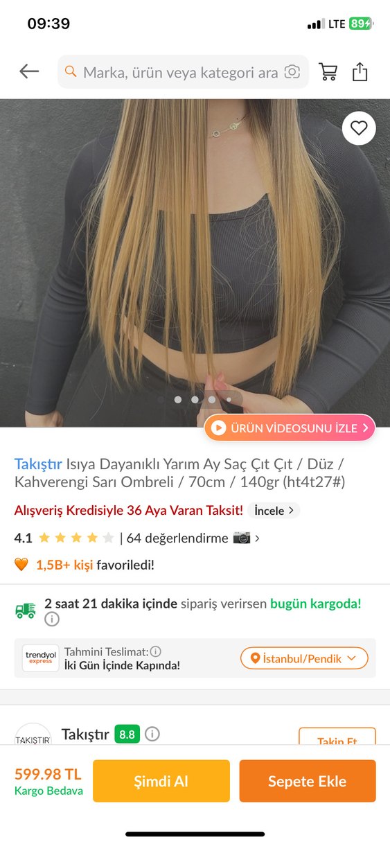 Isıya dayanıklı, kahverengi sarı ombreli, düz yarım ay saç cit cit, 70 cm uzunluk ve 140 gr ağırlıkta.