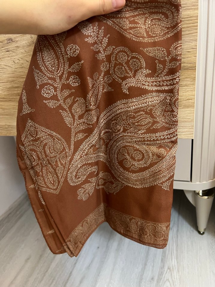 Parlak kahverengi, saten dokulu, bohem desenli, drapeli şal. Retro ve hippie tarzına uygun.
