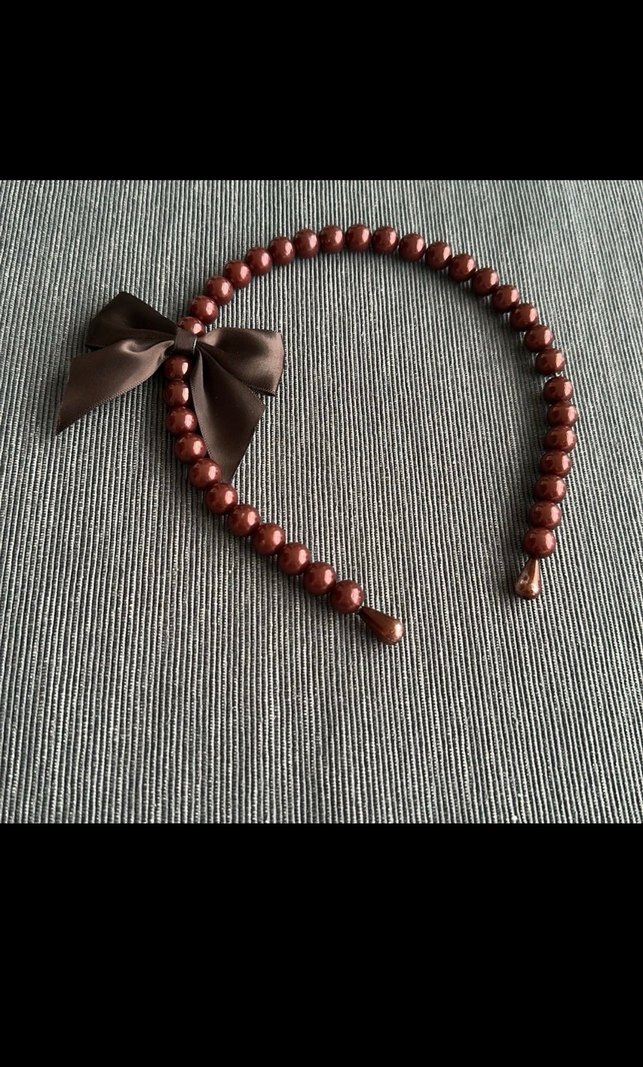 Bohem tarzda, koyu kahverengi ipek görünümlü boncuklar ve uyumlu fiyonk detayına sahip vintage taç.