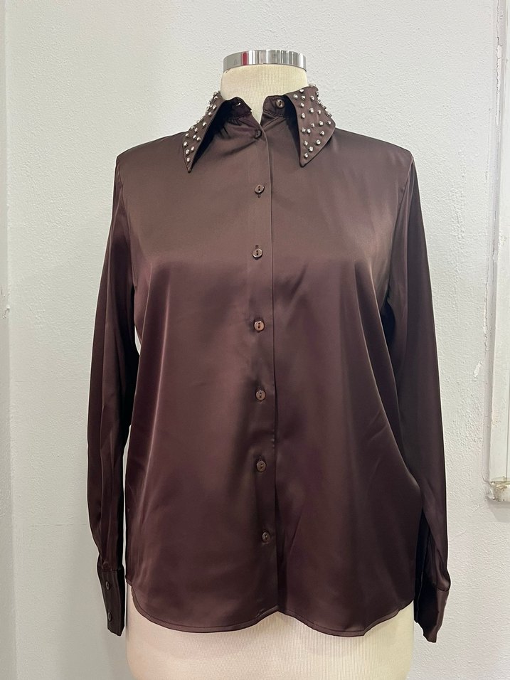Kahverengi saten gömlek, yakasında taşlar ile Uzun kollu, normal kesim ve iş ortamı için uygun. ✨ Hiç giyilmedi her bedeni mevcut