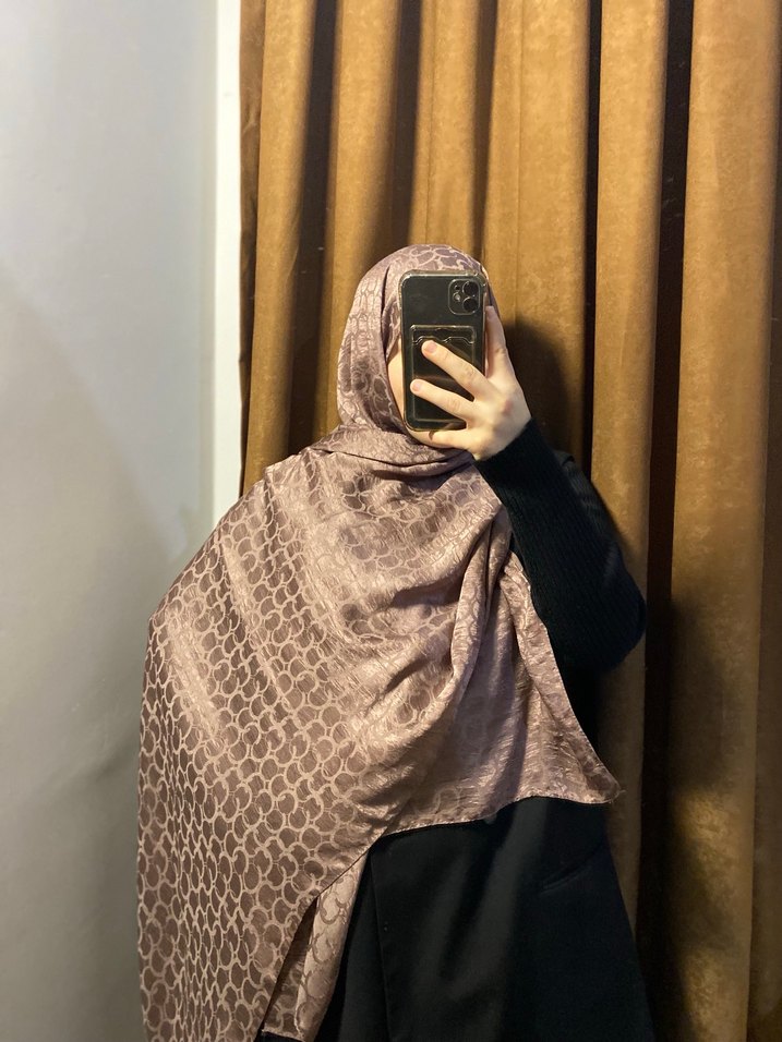 Koyu kahverengi, saten dokulu, drapeli kadın şalı. Tesettür ve rahat sokak stili için uygundur.