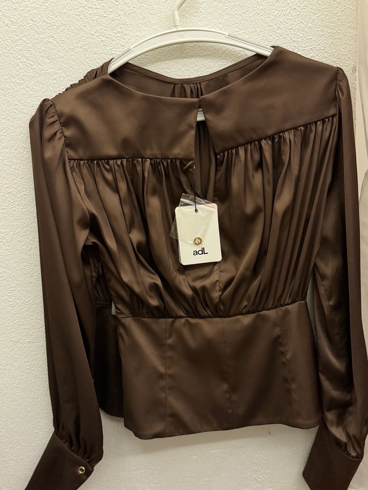 Hiç giyilmedi rengi çok güzel bedeni olmadığı için satıyorum. Uzun kollu, yuvarlak yakalı, kahverengi parlak saten kumaştan kemerli kısa kesim kadın bluz. Ofis ve sokak stiline uygun, baskılı ve vücuda oturan model.