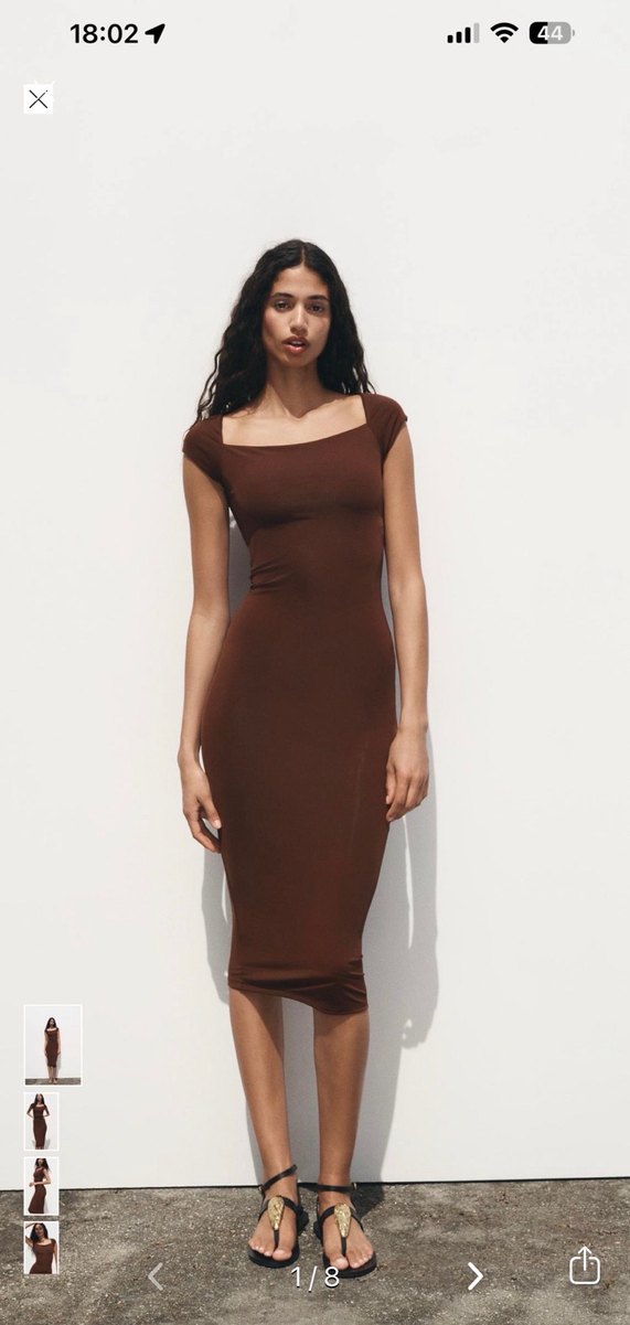 Kahverengi, saten kumaştan, kolsuz ve tek renk midi elbise. Tekne yaka ve vücuda oturan kesimiyle günlük kullanıma uygun, sade ve şık bir tasarım.