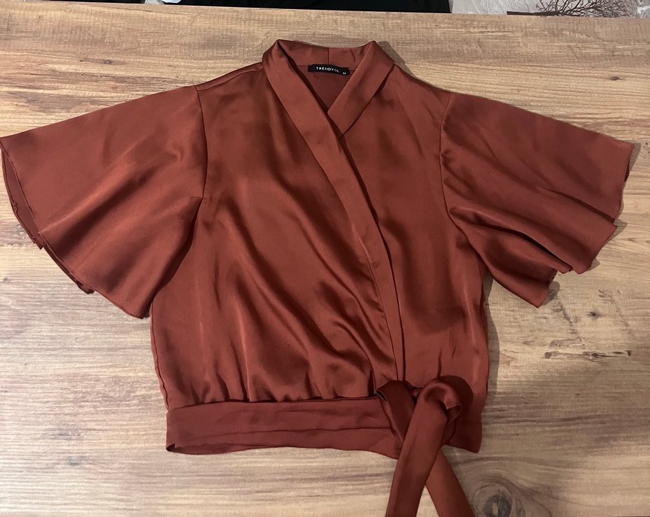Kahverengi saten bluz, V yaka ve kuşaklı beli bağlama detaylı trendyol marka üst