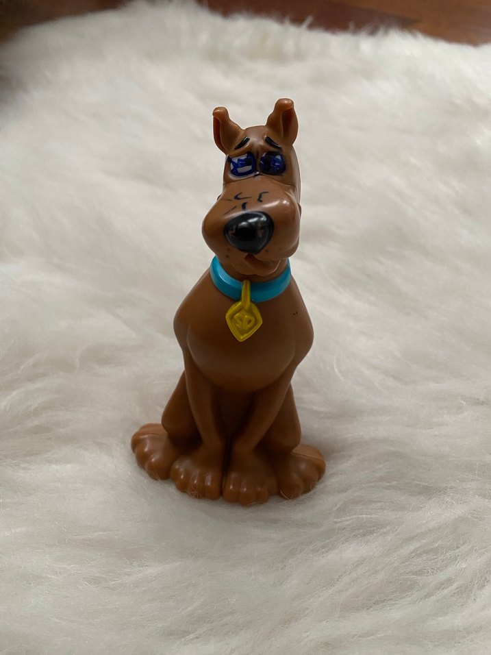 Kahverengi Scooby-Doo figürü, mavi tasması ve sarı etiketi ile karakterin klasik görünümünü yansıtıyor.