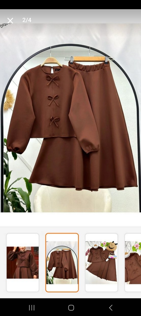 Kahverengi, scuba kumaş etekli takım elbise üst fiyonk detaylı bir kere giyindim sadece herhnagi bir deformasyon yoktur alt etek boyu bir tık kısaltıldı benim boyum 158 fotoğraftaki gibi oluyor