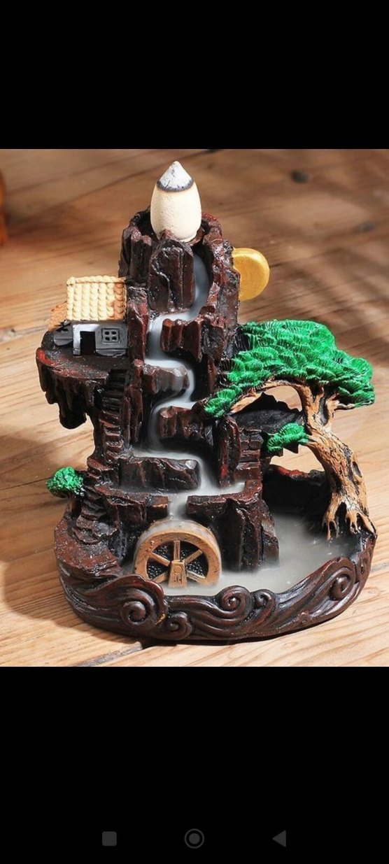 Kahverengi figürin, şelale, küçük ev, yeşil ağaç ve su çarkı ile huzurlu bir doğal manzara sunar.