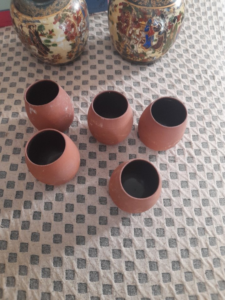 Beş adet kahverengi seramik kupa, pürüzsüz yüzeye sahip, desenli bir örtü üzerinde yer alıyor. ☕