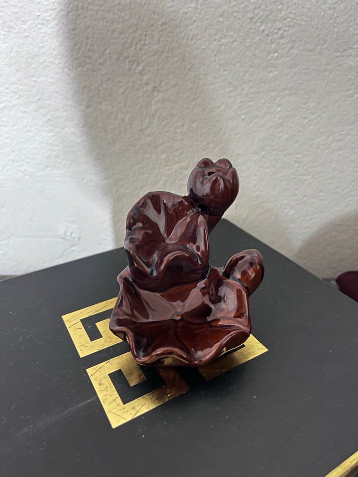 Koyu kahverengi, parlak yüzeyli seramik biblo. Soyut tasarımıyla mekâna sanatsal bir dokunuş katıyor. Buhurdanlık sıfırdır kullanılmadı kutusu ile gönderim yapılacaktır.