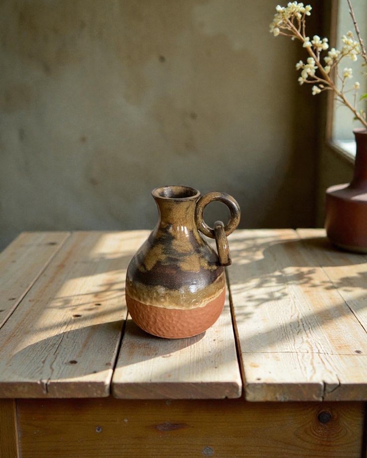 Kahverengi seramikten yapılmış, kulplu ve dokulu tabanlı rustik tarzda seramik obje