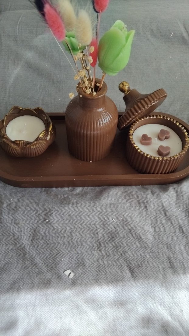 Kahverengi seramik malzemeden yapılmış, üzerinde kalpli mumlar ve küçük bir vazo bulunan, tepsi üzerinde düzenlenmiş dekoratif mum seti. ️ EL YAPIMI TAŞ TOZUNDAN BOYA VERNİKLİ. Piyasadaki alçıdan yapılmış minikler gibi değil. ÖZEL SİPARİŞ RENK MODEL ALINIR. Annemin el emekleri. Beyaz seramikten yapılmış, dokulu tasarımlı vazolu ve kapaklı iki kaplı dekoratif set. ️