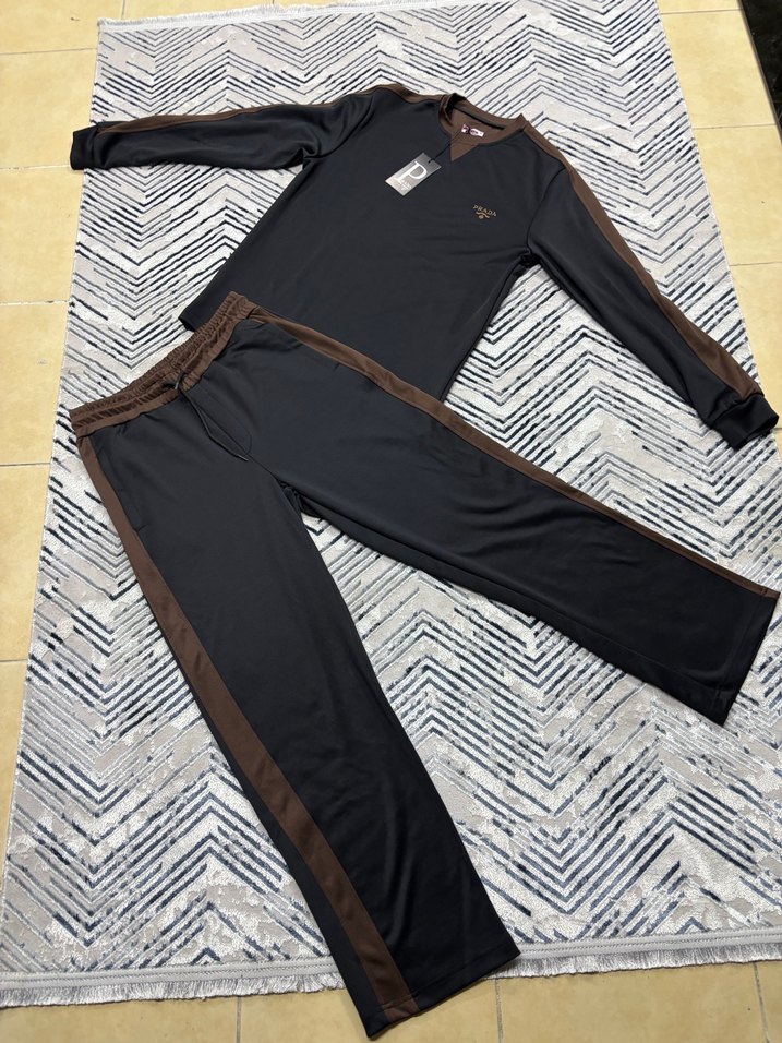 Kadınlar için uzun kollu, bisiklet yaka üst ve kahverengi şeritli uzun pantolonlardan oluşan eşofman takımı. Yumuşak sentetik kumaştan, rahat kesim ve şık günlük kullanım için ideal.