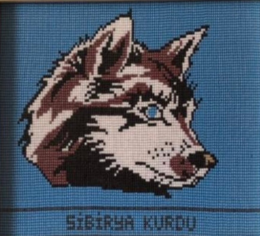 Tamamen boncuklardan yapilmis Mavi zemin üzerinde kahverengi Siberian Kurdu köpek tablo.