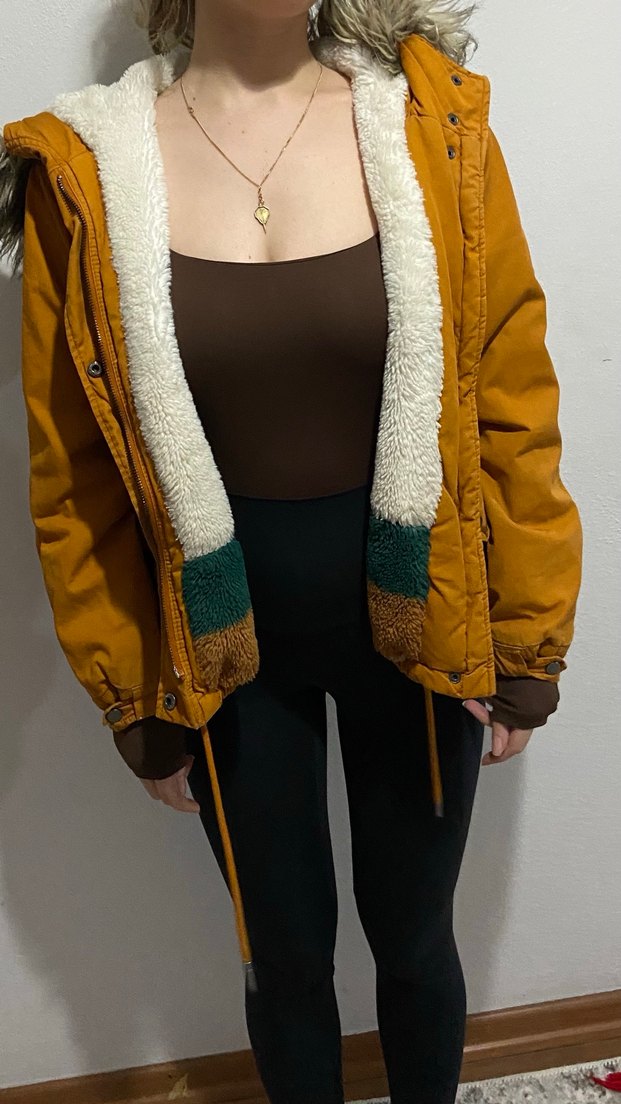Kahverengi, yüksek yakalı ve uzun kollu, sıcak ve yumuşak kürklü astarlı, normal boyda kadın mont. Rahat ve şık sokak stili için uygundur.