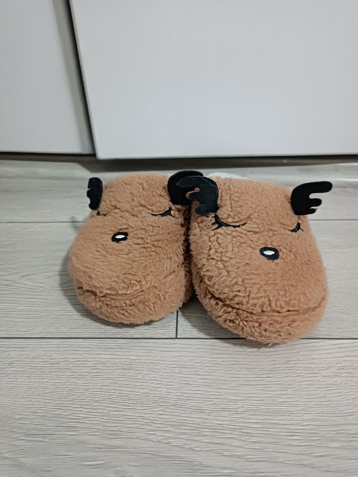 Kahverengi ev terliği, yumuşak peluş dokusu ve tokalı detaylarıyla. Sevimli hayvan yüzü ve küçük boynuzlu tasarımıyla sıcak tutar.